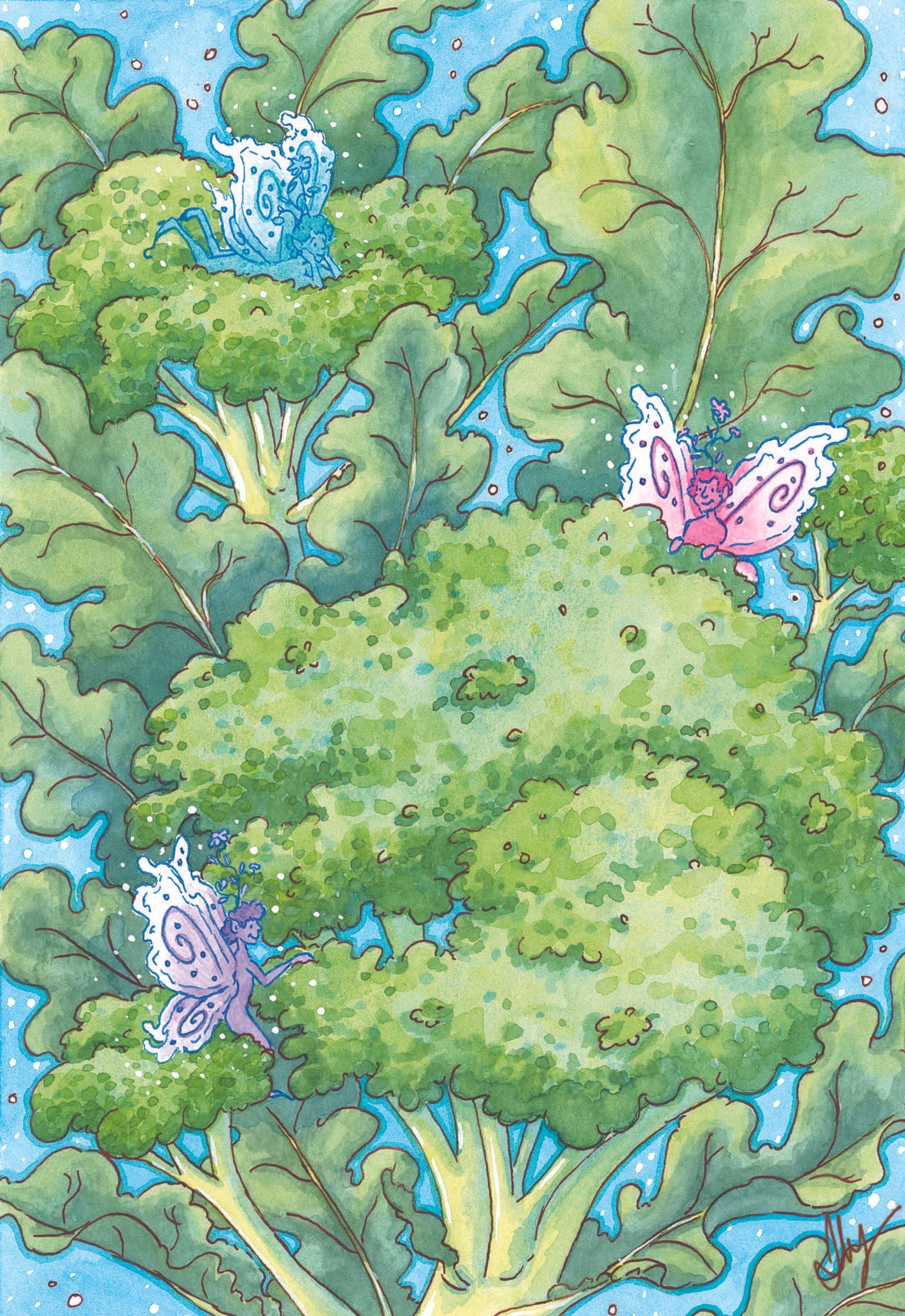 I had the opportunity to illustrate a seed packet for Sow True Seed and they assigned me Broccoli Green Sprouting Calabrese. I wanted to put a magical spin on the veggie and make it fit my style so why not add fairies hiding among the florets!